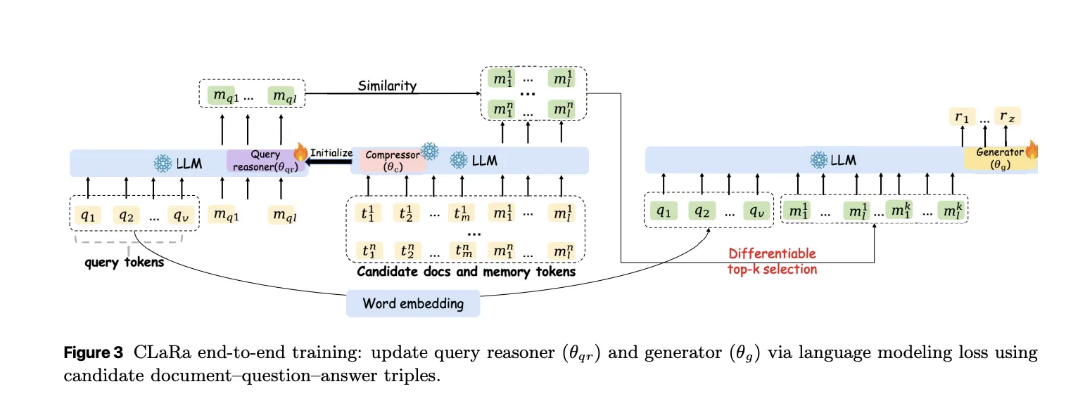 After offline compression, each document is represented only by its memory tokens. CLaRa then trains a query reasoner and an answer generator on top of the same backbone. The query reasoner is another LoRA adapter that maps an input question into the same number of memory tokens used for documents. Retrieval becomes pure embedding search. The system computes cosine similarity between the query embedding and each candidate document embedding.