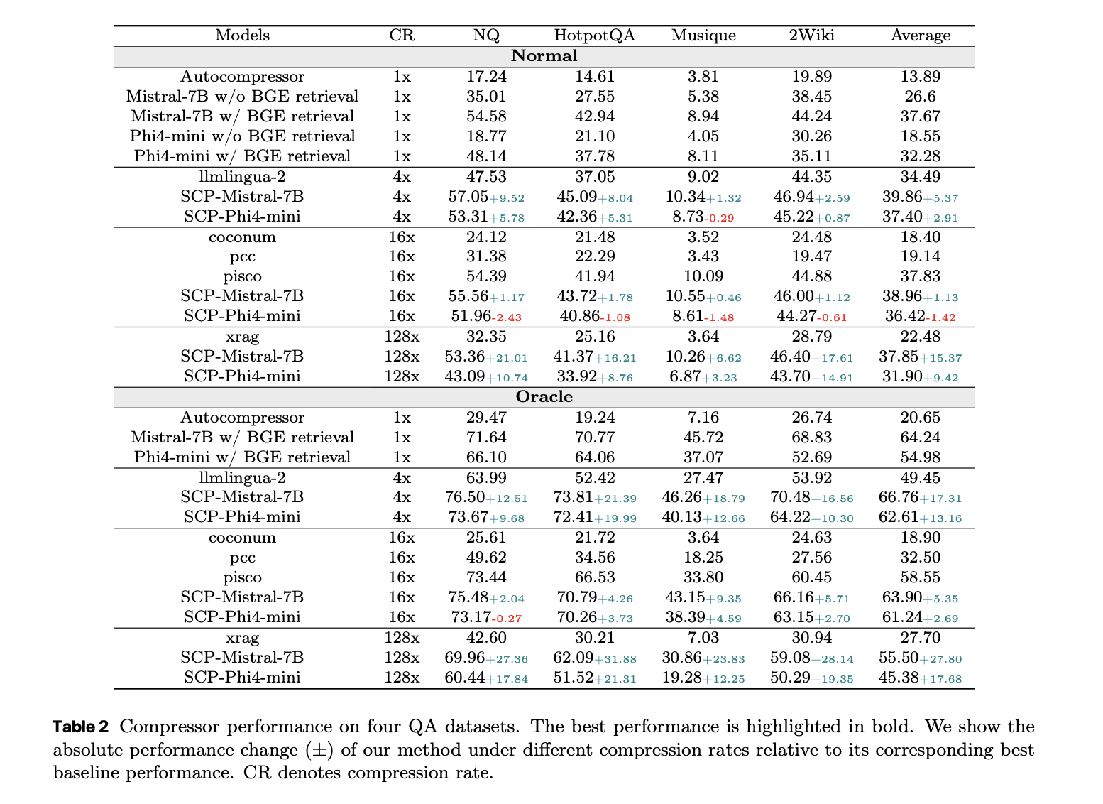 Under the Oracle setting, where the gold document is guaranteed to be in the candidate set, SCP-Mistral-7B at 4 times compression reaches an average F1 of 66.76. That is 17.31 points above LLMLingua-2 and 5.35 points above PISCO. Even more interesting, the compressed representations outperform a BGE based text retriever plus full document Mistral-7B generator by about 2.36 average F1 points for Mistral and about 6.36 points for Phi 4 mini. Well trained soft compression can exceed full text RAG while cutting context length by factors from 4 to 128.