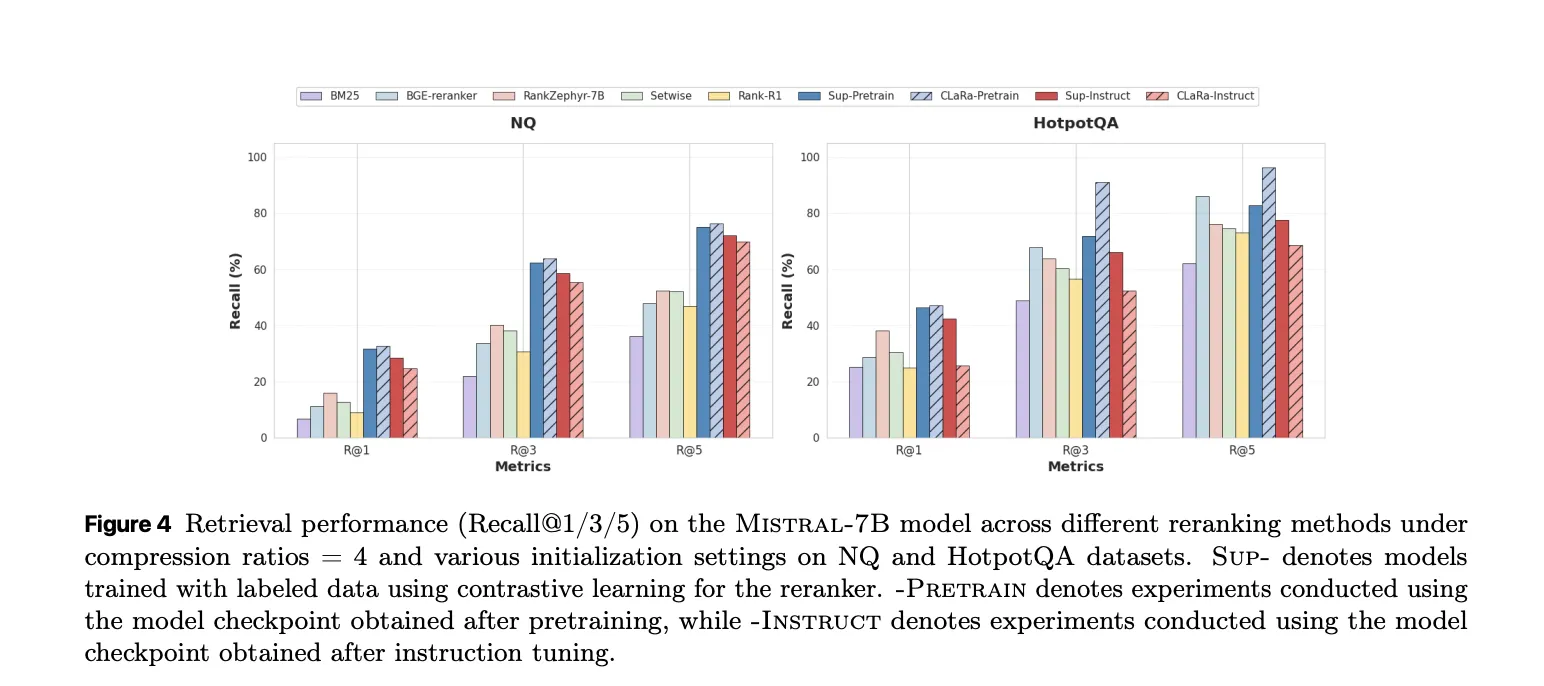 In the Oracle setting, CLaRa-Mistral-7B exceeds 75, F1 on both Natural Questions and HotpotQA at 4 times compression. This shows that the generator can fully exploit accurate retrieval even when all evidence is stored only in compressed memory tokens. Instruction initialized CLaRa generally wins over pre-training initialized CLaRa in the Normal setting, while the gap narrows in Oracle, where retrieval noise is limited.