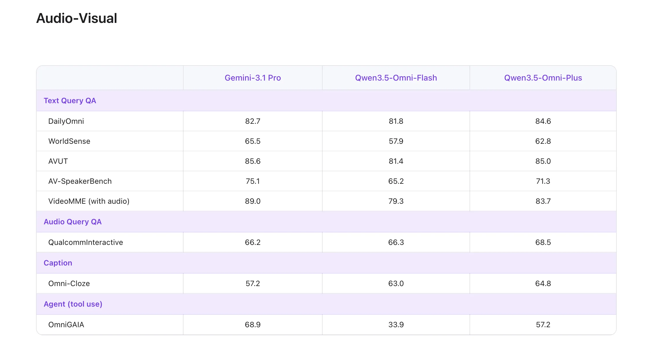 According to their official technical reports, Qwen3.5-Omni-Plus surpasses Gemini 3.1 Pro in general audio understanding, reasoning, recognition, and translation. In audio-visual understanding, it achieves parity with Google’s flagship, while maintaining the core text and visual performance of the standard Qwen3.5 series.