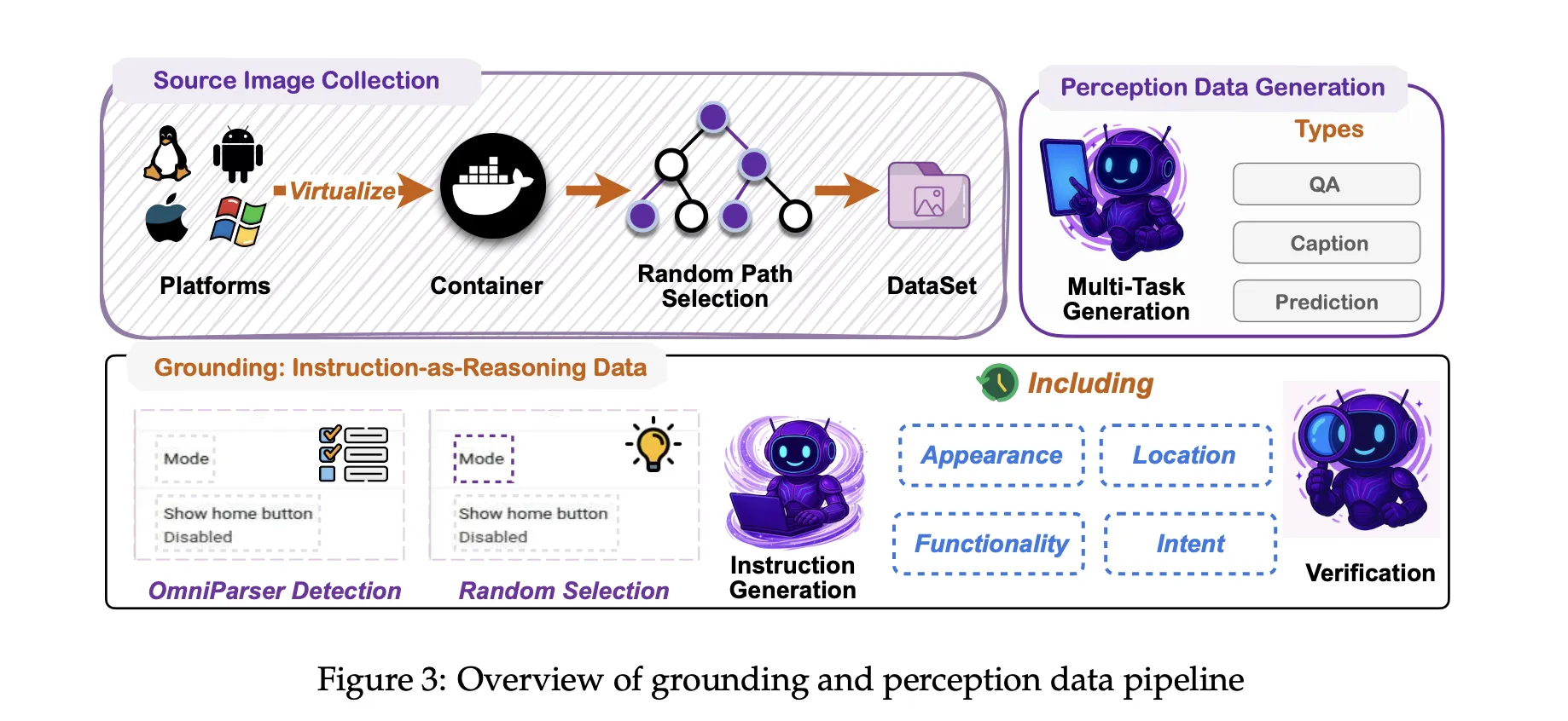 Ground truth boxes are collected from a mix of curated GUI datasets and large scale exploration of virtualized operating systems in containerized environments. Accessibility trees or OCR based parsers are used to align textual metadata with pixel locations. The training objective combines supervised fine tuning with a simple reinforcement signal that rewards correct point in box predictions and valid output format.