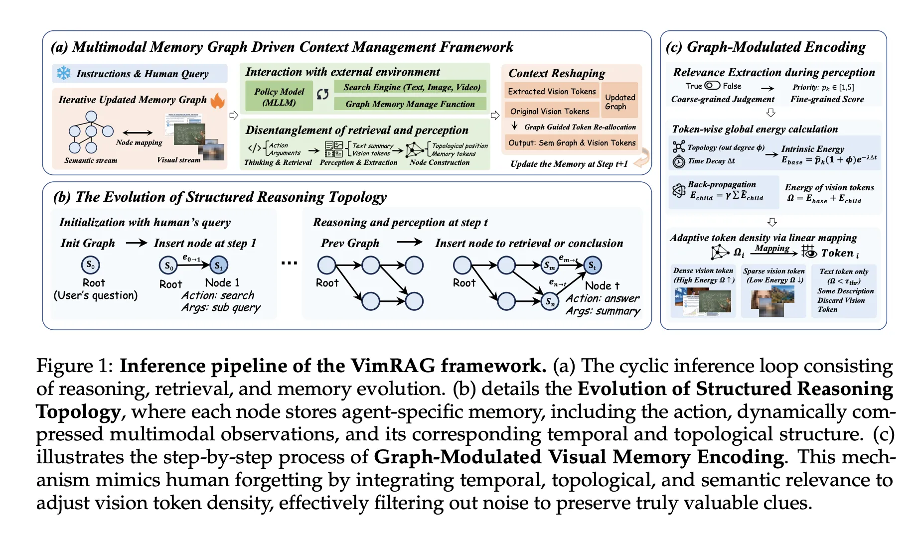 - The second component is Graph-Modulated Visual Memory Encoding, which treats token assignment as a constrained resource allocation problem. For each visual item mi,k, intrinsic energy is computed as Eint(mi,k) = p̂i,k · (1 + deg+G(vi)) · exp(−λ(T − ti)), combining semantic priority, node out-degree for structural relevance, and temporal decay to discount older evidence. Final energy adds recursive reinforcement from successor nodes: , preserving foundational early nodes that support high-value downstream reasoning. Token budgets are allocated proportionally to energy scores across a global top-K selection, with a total resource budget of Stotal = 5 × 256 × 32 × 32. Dynamic allocation is enabled only during inference; training averages pixel values in the memory bank.