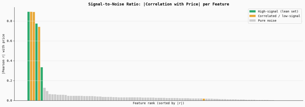 This section measures the signal strength of each feature by computing its absolute correlation with the target variable (price). The bar chart ranks all features by their correlation, highlighting the true high-signal features in green, correlated or weak features in orange, and the large set of pure noise features in gray.
