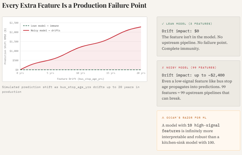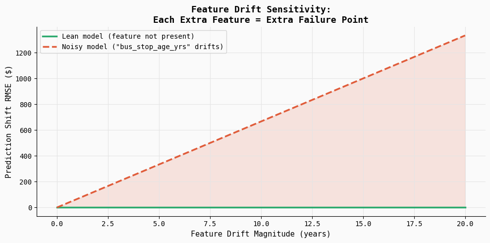 This experiment illustrates how feature drift can silently affect model predictions in production. The code introduces gradual drift into a weak feature (bus_stop_age_yrs) and measures how much the model’s predictions change. Since the lean model does not include this feature, its predictions remain completely stable, while the noisy model becomes increasingly sensitive as the drift magnitude grows.