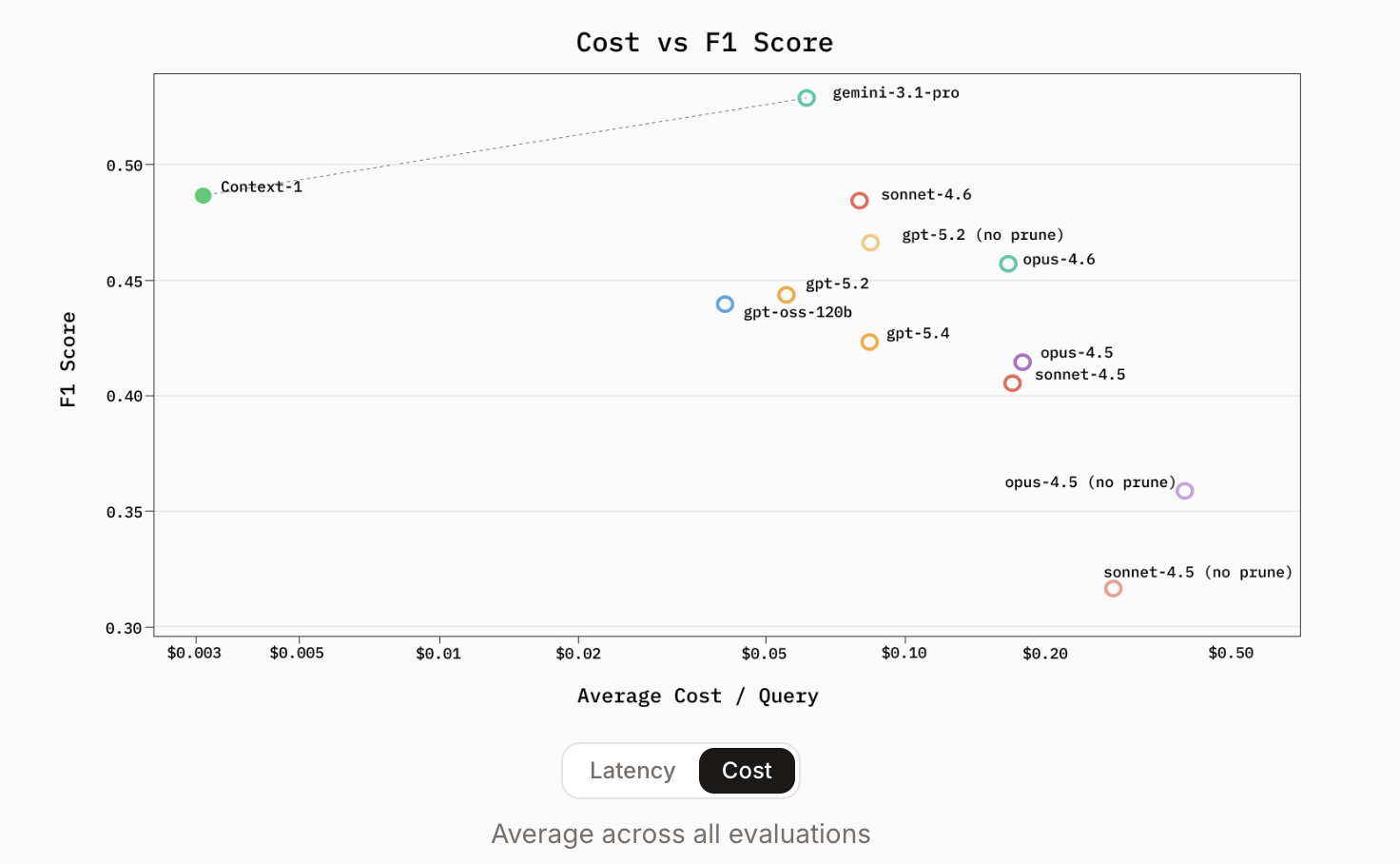 - Pareto Frontier: By using a ‘4x’ configuration—running four Context-1 agents in parallel and merging results via reciprocal rank fusion—it matches the accuracy of a single GPT-5.4 run at a fraction of the compute.