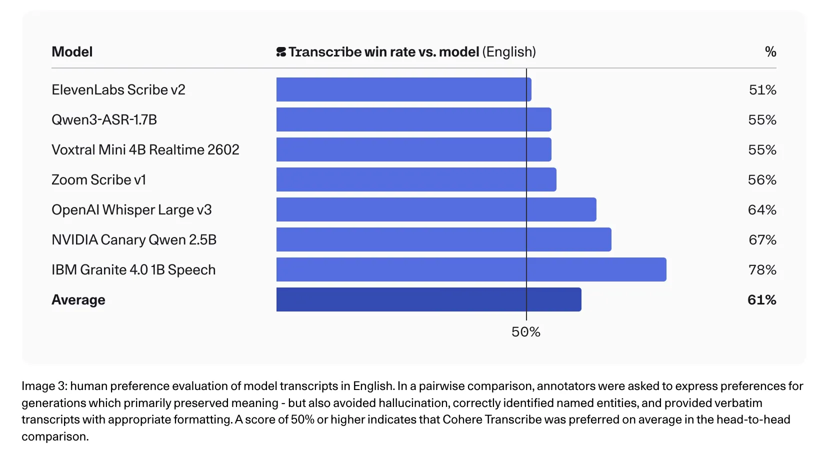 Cohere team also reports stronger human preference results in English, where annotators preferred Transcribe over competing transcripts in head-to-head comparisons, including 78% against IBM Granite 4.0 1B Speech, 67% against NVIDIA Canary Qwen 2.5B, 64% against Whisper Large v3, and 56% against Zoom Scribe v1.