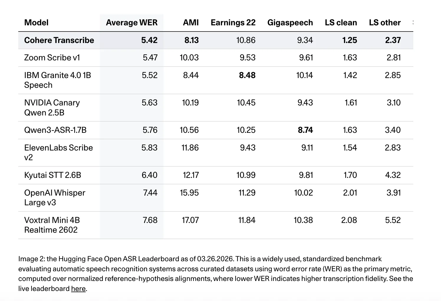 Cohere positions Transcribe as a high-accuracy, production-oriented ASR model. It ranks #1 on the Hugging Face Open ASR Leaderboard (March 26, 2026) with an average WER of 5.42% across benchmark sets including AMI, Earnings22, GigaSpeech, LibriSpeech clean/other, SPGISpeech, TED-LIUM, and VoxPopuli. It also scores 8.13 on AMI, 10.86 on Earnings22, 9.34 on GigaSpeech, 1.25 on LibriSpeech clean, 2.37 on LibriSpeech other, 3.08 on SPGISpeech, 2.49 on TED-LIUM, and 5.87 on VoxPopuli, outperforming models such as Whisper Large v3 (7.44 average WER), ElevenLabs Scribe v2 (5.83), and Qwen3-ASR-1.7B (5.76) on various leaderboards.