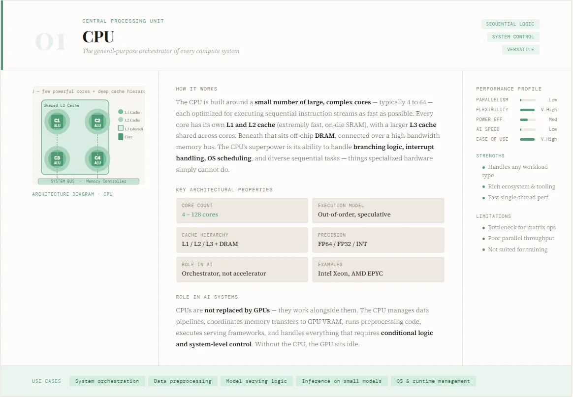 The CPU (Central Processing Unit) remains the foundational building block of modern computing and continues to play a critical role even in AI-driven systems. Designed for general-purpose workloads, CPUs excel at handling complex logic, branching operations, and system-level orchestration. They act as the “brain” of a computer—managing operating systems, coordinating hardware components, and executing a wide range of applications from databases to web browsers. While AI workloads have increasingly shifted toward specialized hardware, CPUs are still indispensable as controllers that manage data flow, schedule tasks, and coordinate accelerators like GPUs and TPUs.
