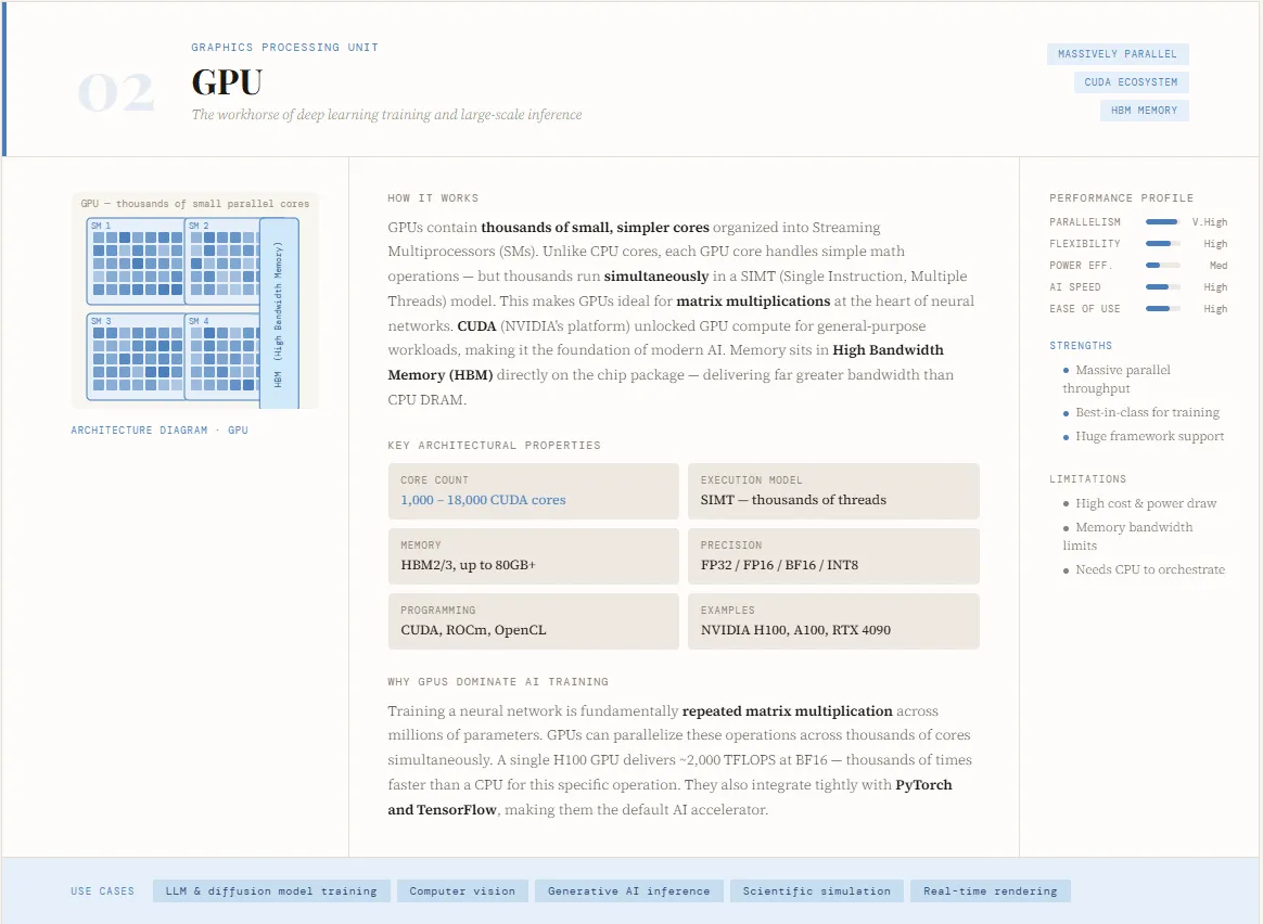 The GPU (Graphics Processing Unit) has become the backbone of modern AI, especially for training deep learning models. Originally designed for rendering graphics, GPUs evolved into powerful compute engines with the introduction of platforms like CUDA, enabling developers to harness their parallel processing capabilities for general-purpose computing. Unlike CPUs, which focus on sequential execution, GPUs are built to handle thousands of operations simultaneously—making them exceptionally well-suited for the matrix multiplications and tensor operations that power neural networks. This architectural shift is precisely why GPUs dominate AI training workloads today.