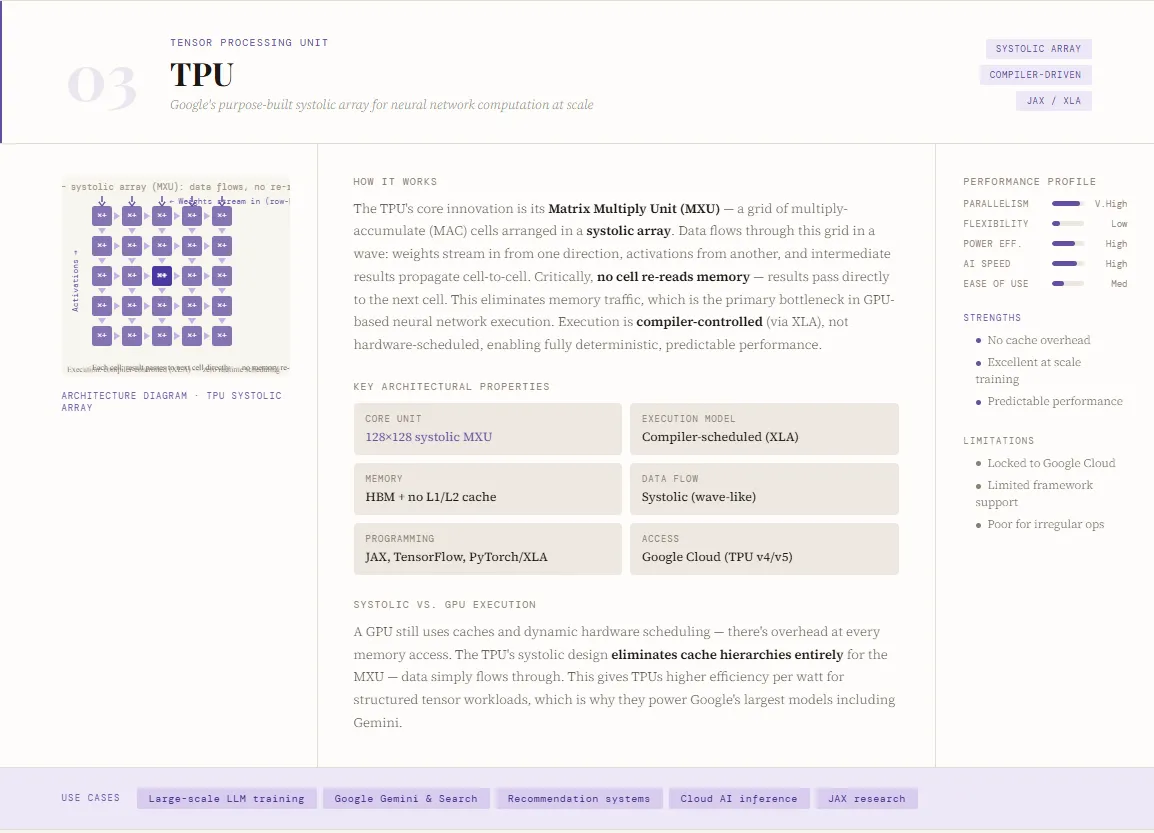 The TPU (Tensor Processing Unit) is a highly specialized AI accelerator designed by Google specifically for neural network workloads. Unlike CPUs and GPUs, which retain some level of general-purpose flexibility, TPUs are purpose-built to maximize efficiency for deep learning tasks. They power many of Google’s large-scale AI systems—including search, recommendations, and models like Gemini—serving billions of users globally. By focusing purely on tensor operations, TPUs push performance and efficiency further than GPUs, particularly in large-scale training and inference scenarios deployed via platforms like Google Cloud.