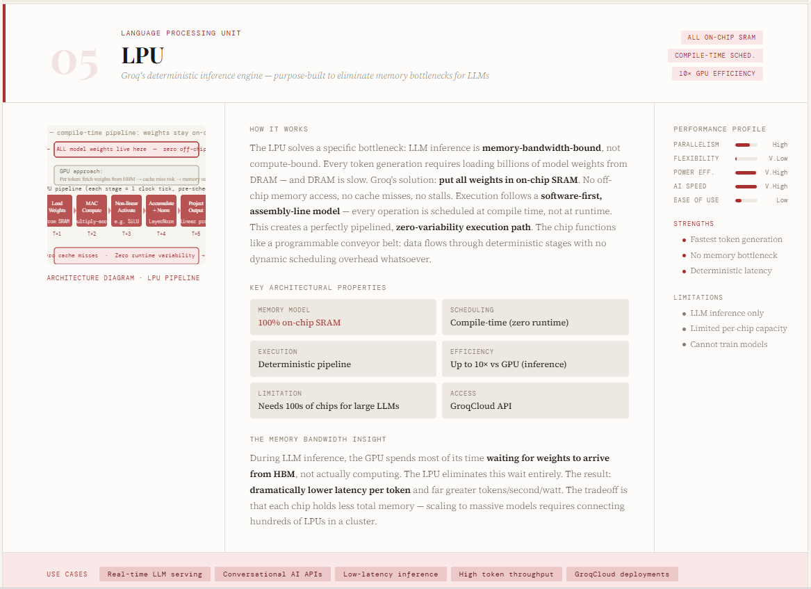 However, this extreme specialization introduces tradeoffs: each chip has limited memory capacity, requiring hundreds of LPUs to be connected for serving large models. Despite this, the latency and efficiency gains are substantial, especially for real-time AI applications. In many ways, LPUs represent the far end of the AI hardware evolution spectrum—moving from general-purpose flexibility (CPUs) to highly deterministic, inference-optimized architectures built purely for speed and efficiency.