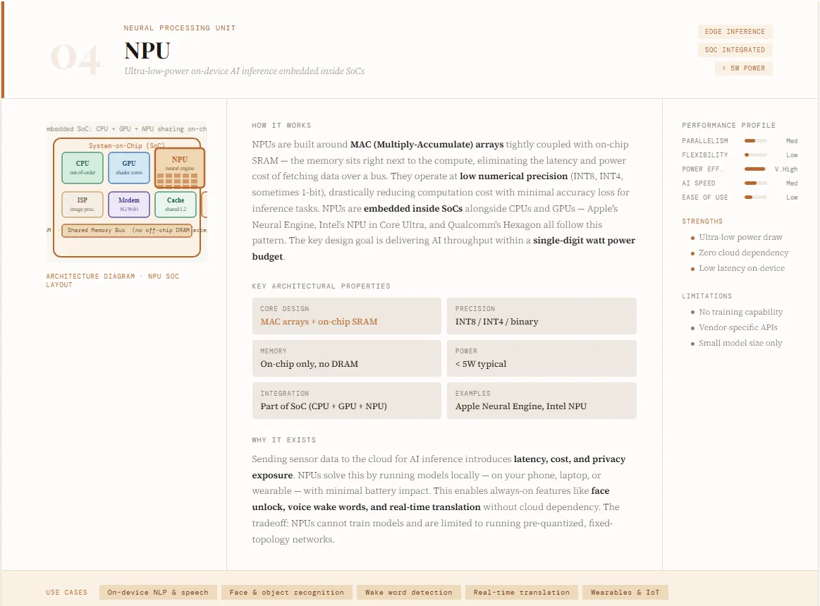 The NPU (Neural Processing Unit) is an AI accelerator designed specifically for efficient, low-power inference—especially at the edge. Unlike GPUs that target large-scale training or data center workloads, NPUs are optimized to run AI models directly on devices like smartphones, laptops, wearables, and IoT systems. Companies like Apple (with its Neural Engine) and Intel have adopted this architecture to enable real-time AI features such as speech recognition, image processing, and on-device generative AI. The core design focuses on delivering high throughput with minimal energy consumption, often operating within single-digit watt power budgets.