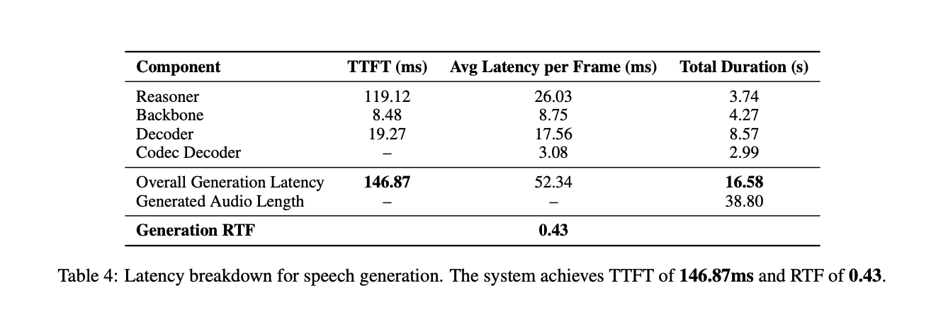 Latency is measured with one concurrent stream. For a 38.80 second response, the total generation time is 16.58 seconds, which gives a Real Time Factor (RTF) of 0.43. The Reasoner contributes 119.12 ms TTFT, the Backbone 8.48 ms and the Decoder 19.27 ms per frame on average. The Codec Decoder works on groups of 4 frames so TTFT does not apply to that component. The overall Time to First Token is 146.87 ms, which is well under one second and suitable for interactive dialogue.