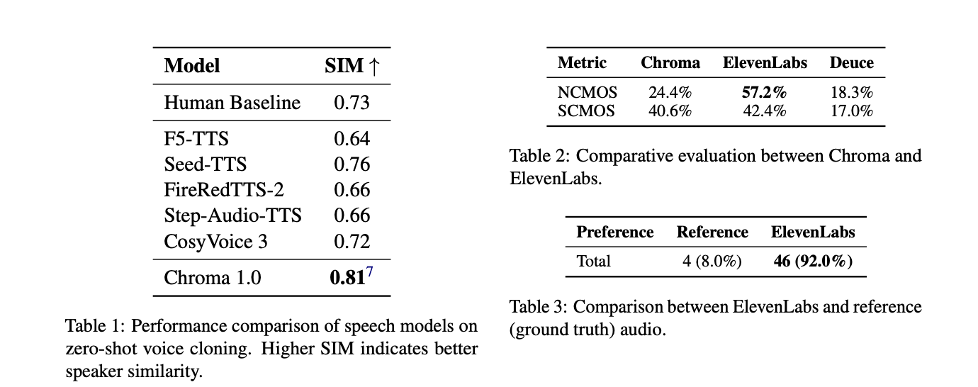 - Strong personalized voice cloning: On SEED-TTS-EVAL with CommonVoice speakers, Chroma reaches a Speaker Similarity score of 0.81 at 24 kHz, this is reported as a 10.96 percent relative improvement over the human baseline of 0.73 and outperforms CosyVoice 3 and other TTS baselines.