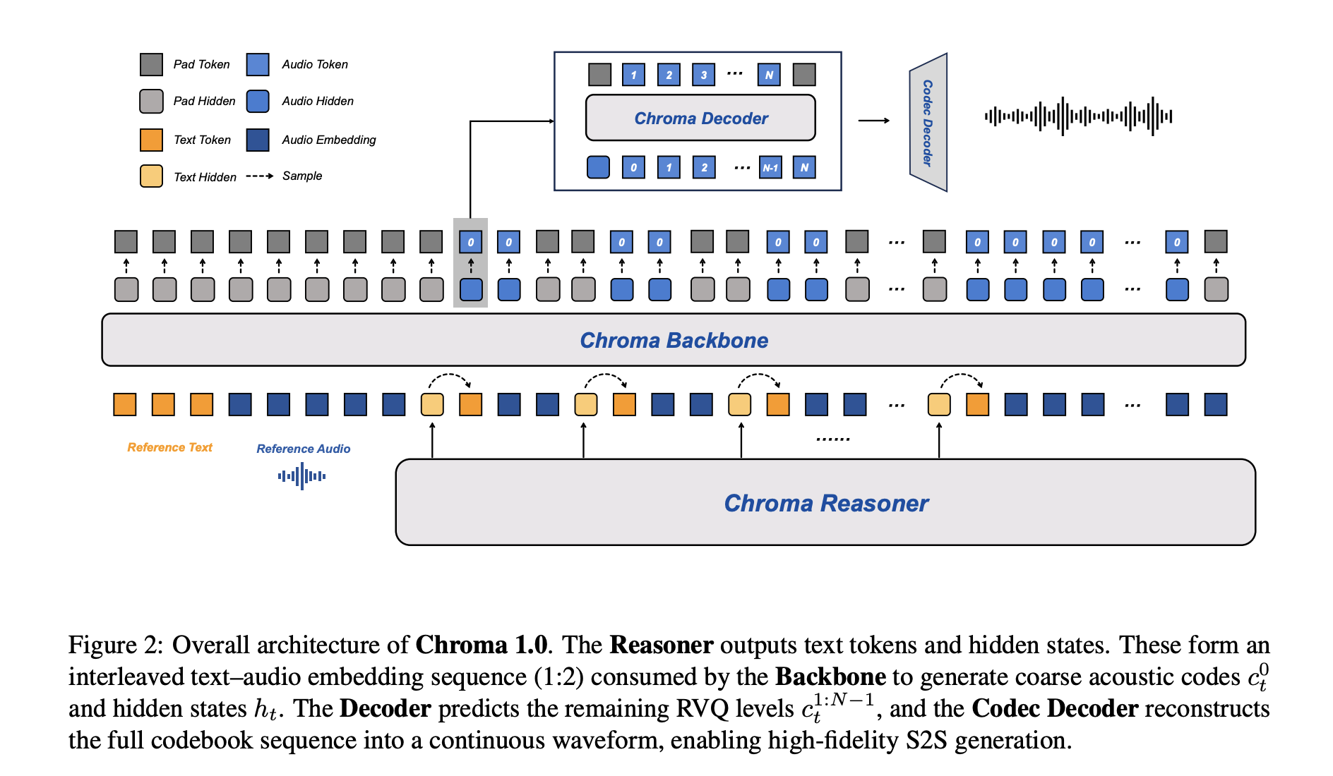 Chroma 1.0 has two main subsystems. The Chroma Reasoner handles multimodal understanding and text generation. The speech stack, Chroma Backbone, Chroma Decoder and Chroma Codec Decoder, converts that semantic output into personalized response audio.