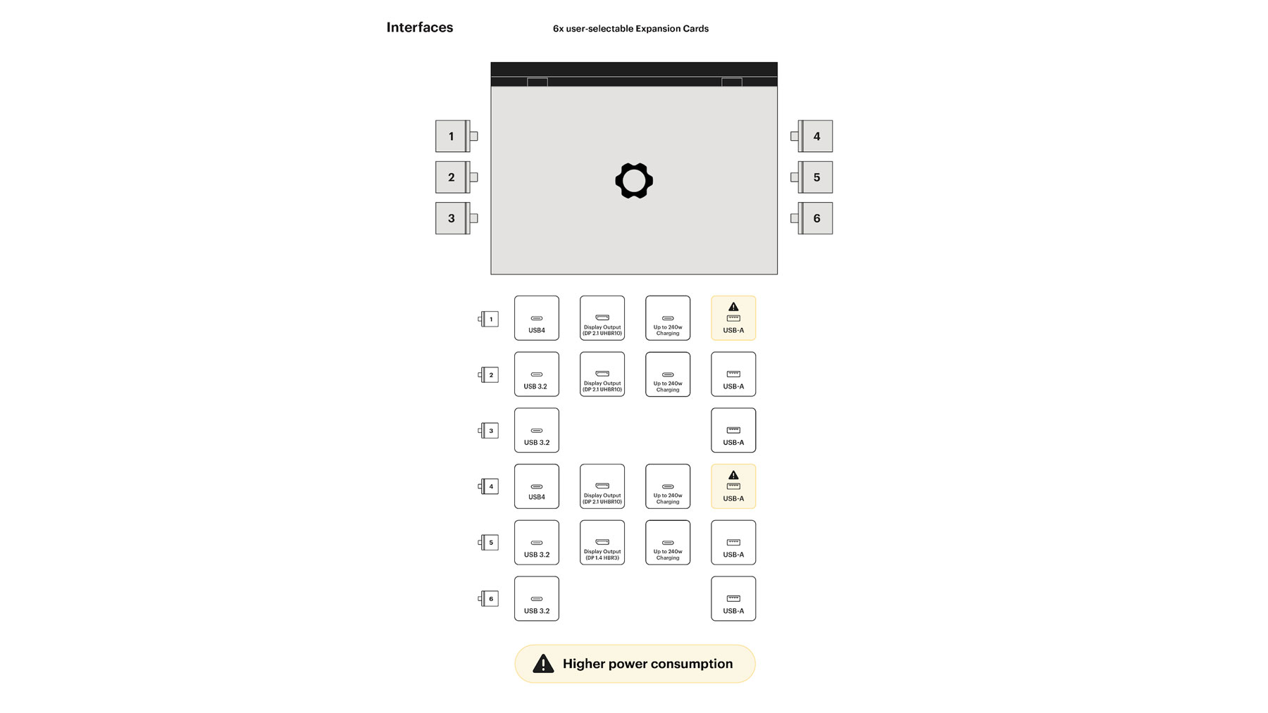 Port flexibility remains tied to the expansion card chosen. AMD‑based configurations use a specific set of slots, so users must plan which ports they need ahead of time.