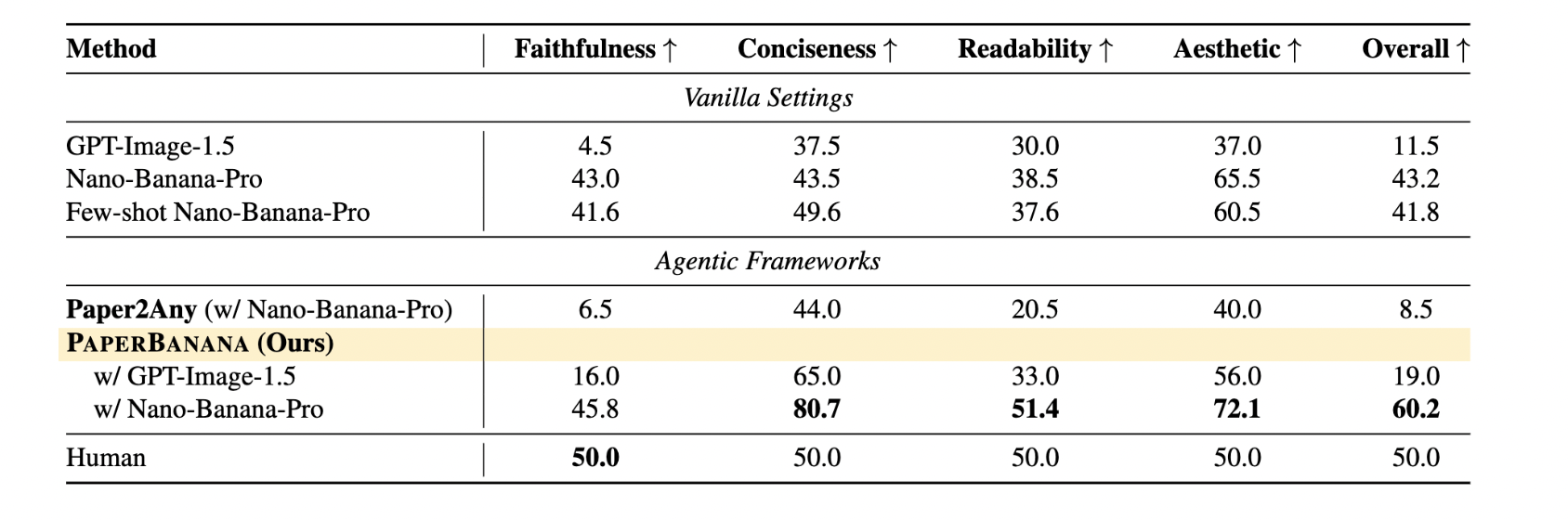 - Superior Performance on PaperBananaBench: Evaluated against 292 test cases from NeurIPS 2025, the framework outperformed vanilla baselines in Overall Score (+17.0%), Conciseness (+37.2%), Readability (+12.9%), and Aesthetics (+6.6%).