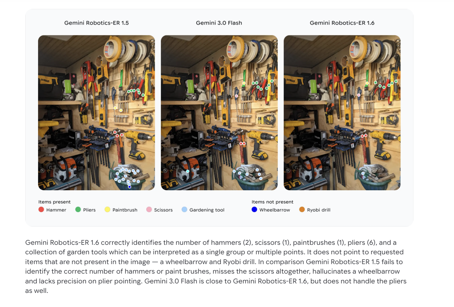 In internal benchmarks, Gemini Robotics-ER 1.6 demonstrates a clear advantage over its predecessor. Gemini Robotics-ER 1.6 correctly identifies the number of hammers, scissors, paintbrushes, pliers, and garden tools in a scene, and does not point to requested items that are not present in the image — such as a wheelbarrow and Ryobi drill. In comparison, Gemini Robotics-ER 1.5 fails to identify the correct number of hammers or paintbrushes, misses scissors altogether, and hallucinates a wheelbarrow. For AI Robotics professionals this matters because hallucinated object detections in robotic pipelines can cause cascading downstream failures — a robot that ‘sees’ an object that isn’t there will attempt to interact with empty space.