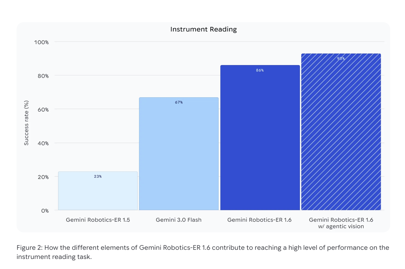 - Instrument reading is the biggest new capability: Built in collaboration with Boston Dynamics’ Spot robot for industrial facility inspection, Gemini Robotics-ER 1.6 can now read analog gauges, pressure meters, and sight glasses with 93% accuracy using agentic vision — up from just 23% in Gemini Robotics-ER 1.5, which lacked the capability entirely.