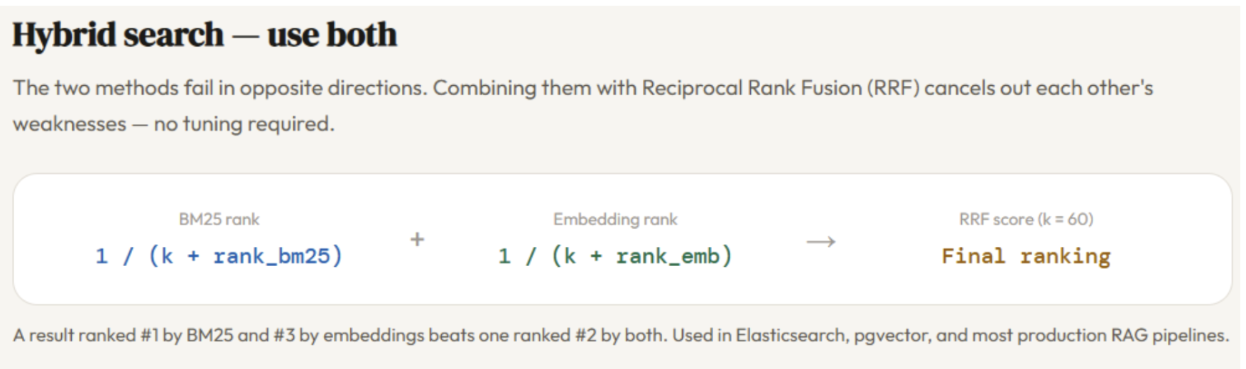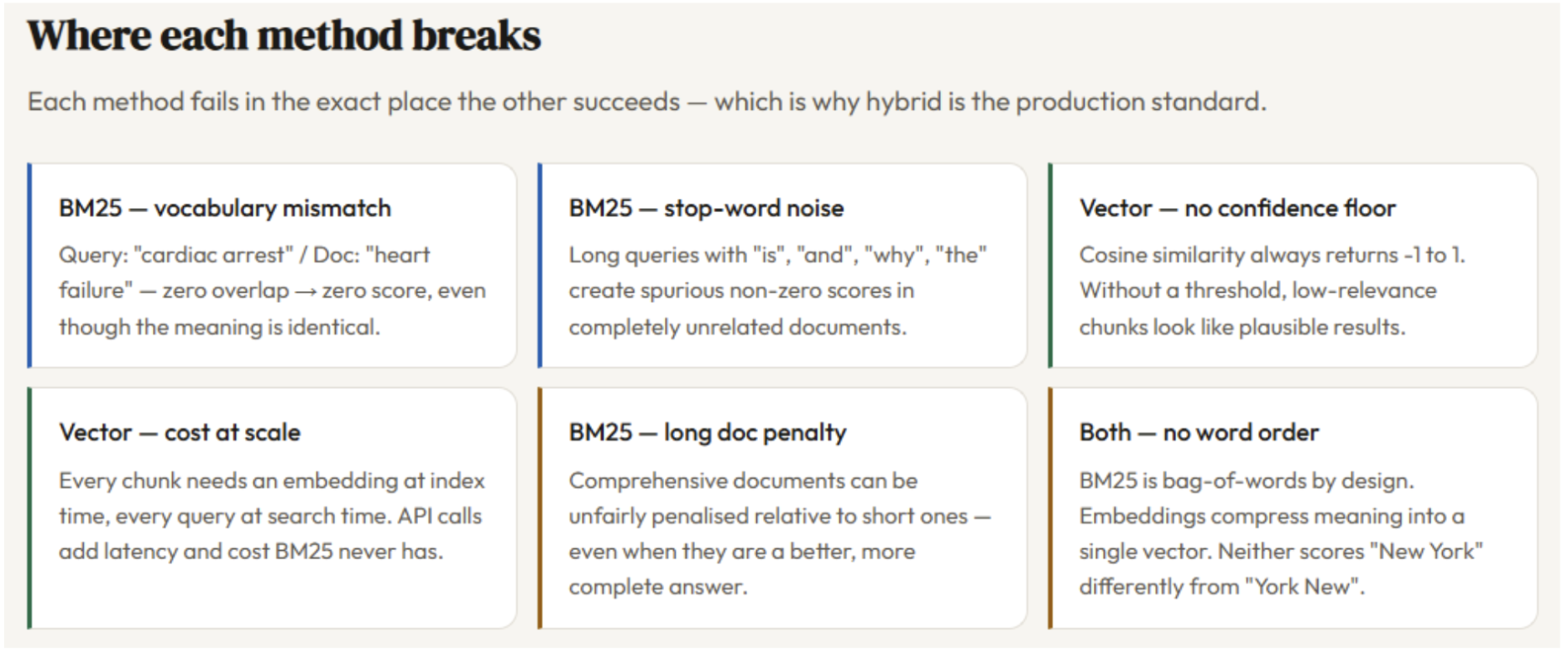 The tradeoff is practical: BM25 requires no model, no GPU, and no API call — it’s fast, lightweight, and fully explainable. Vector search requires an embedding model at index time and query time, adds latency and cost, and produces scores that are harder to interpret. Neither is strictly better; they fail in opposite directions, which is exactly why hybrid search — combining both — has become the production standard.