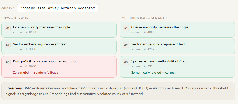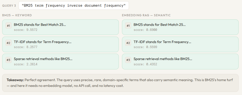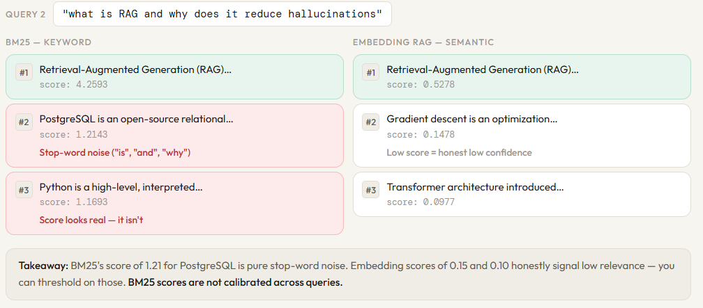 print(f"n {'BM25 (keyword)':<35} {'Embedding RAG (semantic)'}")