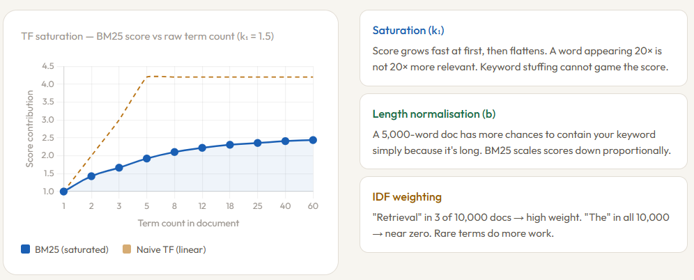 The term frequency component is where BM25 gets clever. Rather than counting raw occurrences, it applies saturation — the score grows quickly at first but flattens out as frequency increases. A term appearing 5 times contributes much more than a term appearing once, but a term appearing 50 times contributes barely more than one appearing 20 times. This is controlled by the parameter k₁ (typically set between 1.2 and 2.0). Set it low and the saturation kicks in fast; set it high and raw frequency matters more. This single design choice is what makes BM25 resistant to keyword stuffing — repeating a word a hundred times in a document won’t game the score.