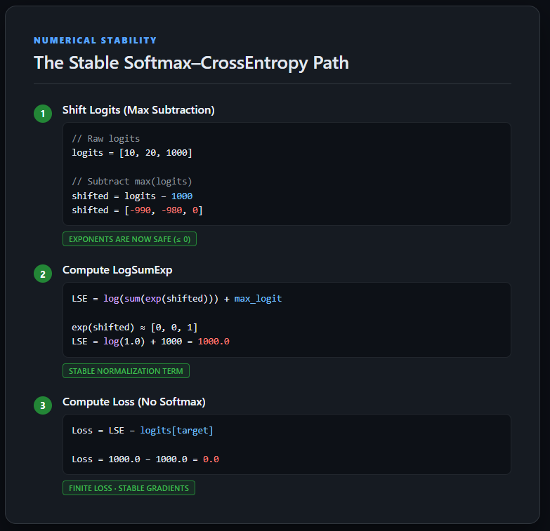 The key fix is simple but critical: shift logits before exponentiation and operate in the log domain whenever possible. Most importantly, training rarely requires explicit probabilities—stable log-probabilities are sufficient and far safer. When a loss suddenly turns into NaN in production, it’s often a signal that Softmax is being computed manually somewhere it shouldn’t be.