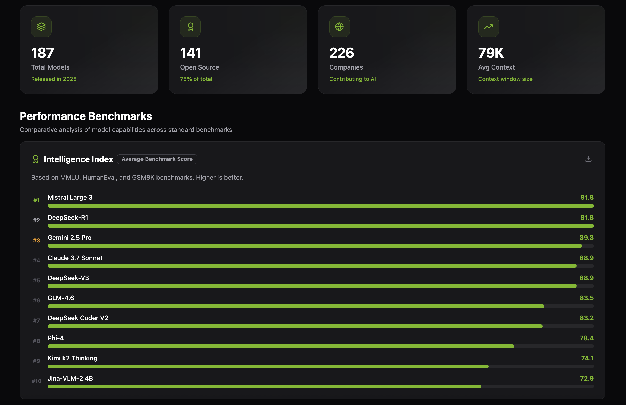 - A Model Leaderboard that aggregates scores and metadata for a broader 2025 model set