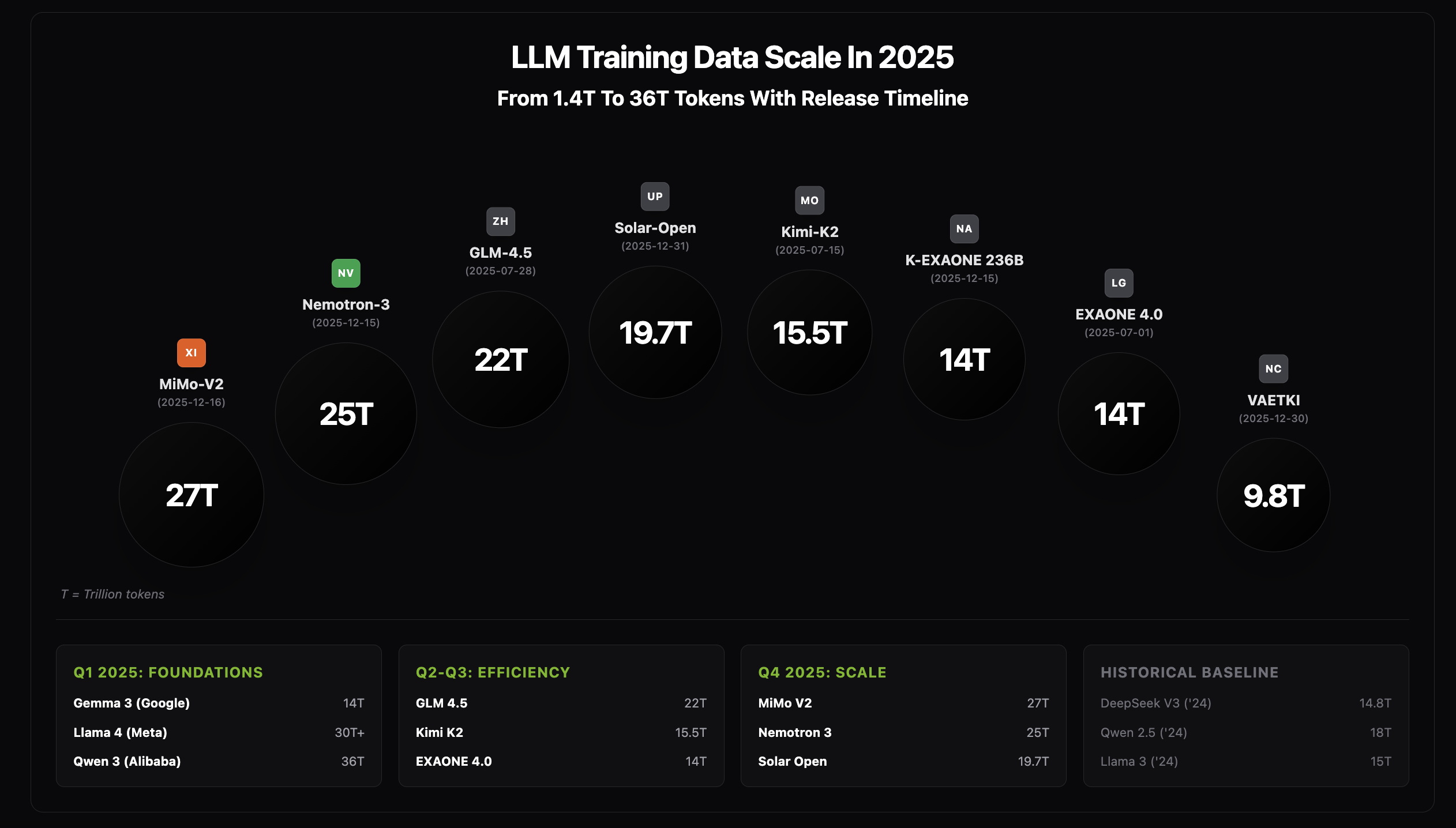 LLM Training Data Scale in 2025: token scale with timeline alignment