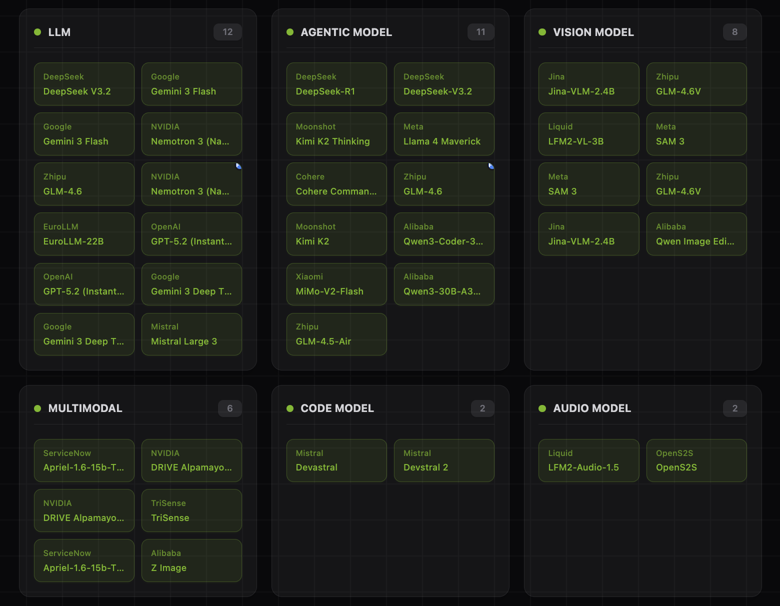 Model category coverage in the market map is explicitly typed, enabling faceted queries and comparative analysis. The distribution includes LLM (58), Agentic Model (11), Vision Model (8), Tool (7), Multimodal (6), Framework (4), Code Model (2), Audio Model (2), plus Embedding Model (1) and Agent (1).