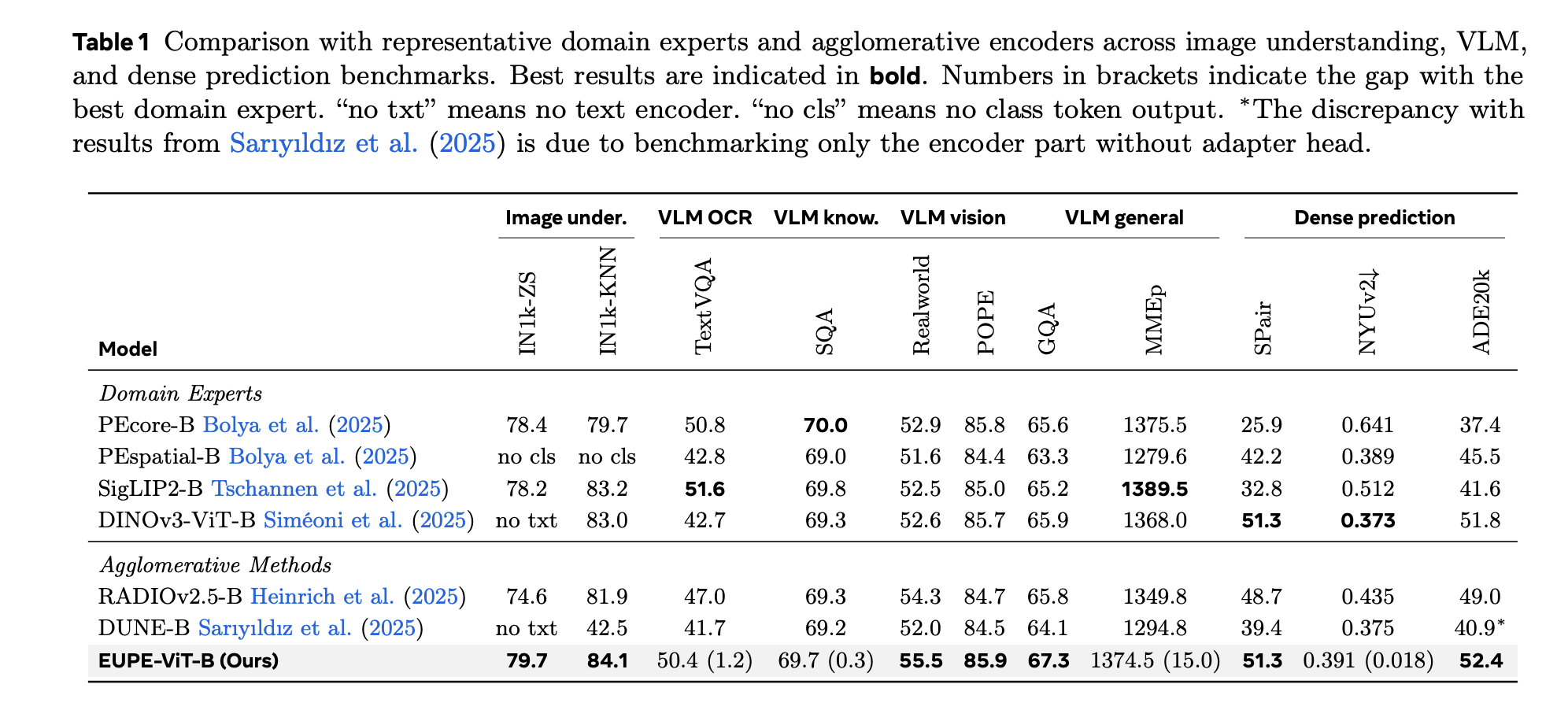 - One encoder to rule them all. EUPE is a single compact vision encoder (under 100M parameters) that matches or outperforms specialized domain-expert models across image understanding, dense prediction, and vision-language modeling — tasks that previously required separate, dedicated encoders.