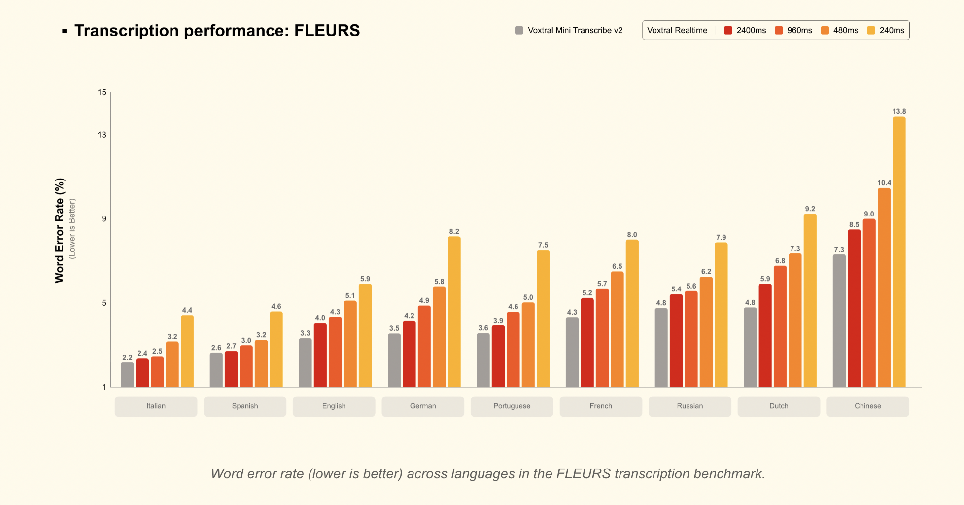 Language coverage mirrors Realtime: 13 languages, with Mistral noting that non-English performance “significantly outpaces competitors” in their evaluation.