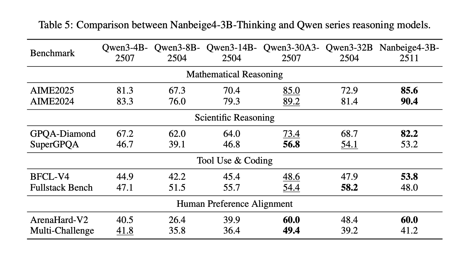- 3B can lead much larger open models on reasoning, under the paper’s averaged sampling setup. Nanbeige4-3B-Thinking reports AIME 2024 avg@8 90.4 vs Qwen3-32B 81.4, and GPQA-Diamond avg@3 82.2 vs Qwen3-14B 64.0.