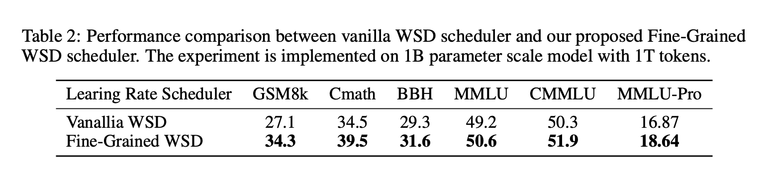 - Pretraining gains are tied to data curriculum, not just more tokens. Fine-Grained WSD schedules higher quality mixtures later, and the 1B ablation shows GSM8K moving from 27.1 to 34.3 versus vanilla scheduling.