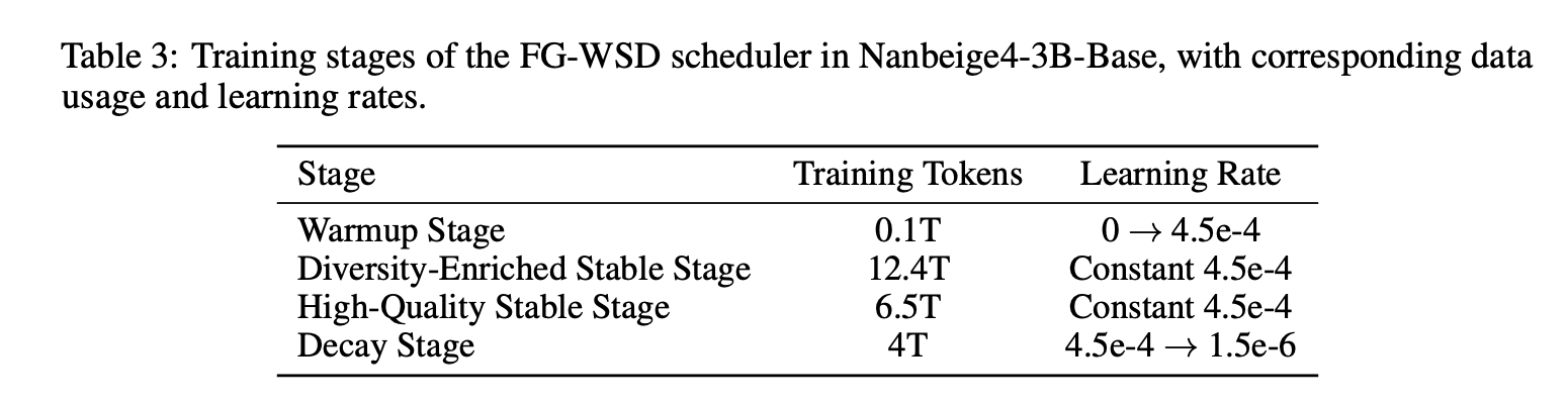 Most similar research projects treat warmup stable decay as a learning rate schedule only. Nanbeige4-3B adds a data curriculum inside the stable phase via FG-WSD, Fine-Grained Warmup-Stable-Decay. Instead of sampling a fixed mixture throughout stable training, they progressively concentrate higher quality data later in training.