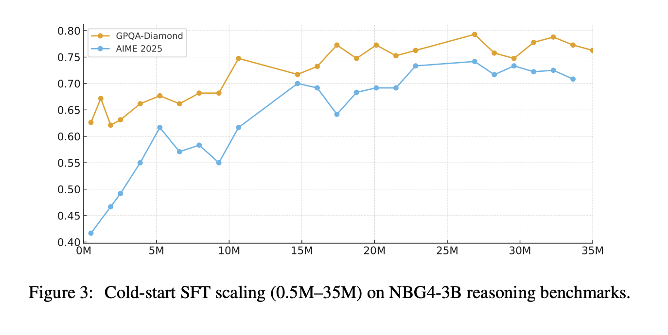 Post training starts with cold start SFT, then overall SFT. The cold start stage uses about 30M QA samples focused on math, science, and code, with 32K context length, and a reported mix of about 50% math reasoning, 30% scientific reasoning, and 20% code tasks. The research team also claim that scaling cold start SFT instructions from 0.5M to 35M keeps improving AIME 2025 and GPQA-Diamond, with no early saturation in their experiments.