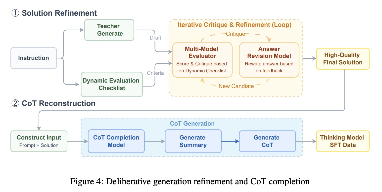 Overall SFT shifts to a 64K context length mix including general conversation and writing, agent style tool use and planning, harder reasoning that targets weaknesses, and coding tasks. This stage introduces Solution refinement plus Chain-of-Thought reconstruction. The system runs iterative generate, critique, revise cycles guided by a dynamic checklist, then uses a chain completion model to reconstruct a coherent CoT that is consistent with the final refined solution. This is meant to avoid training on broken reasoning traces after heavy editing.