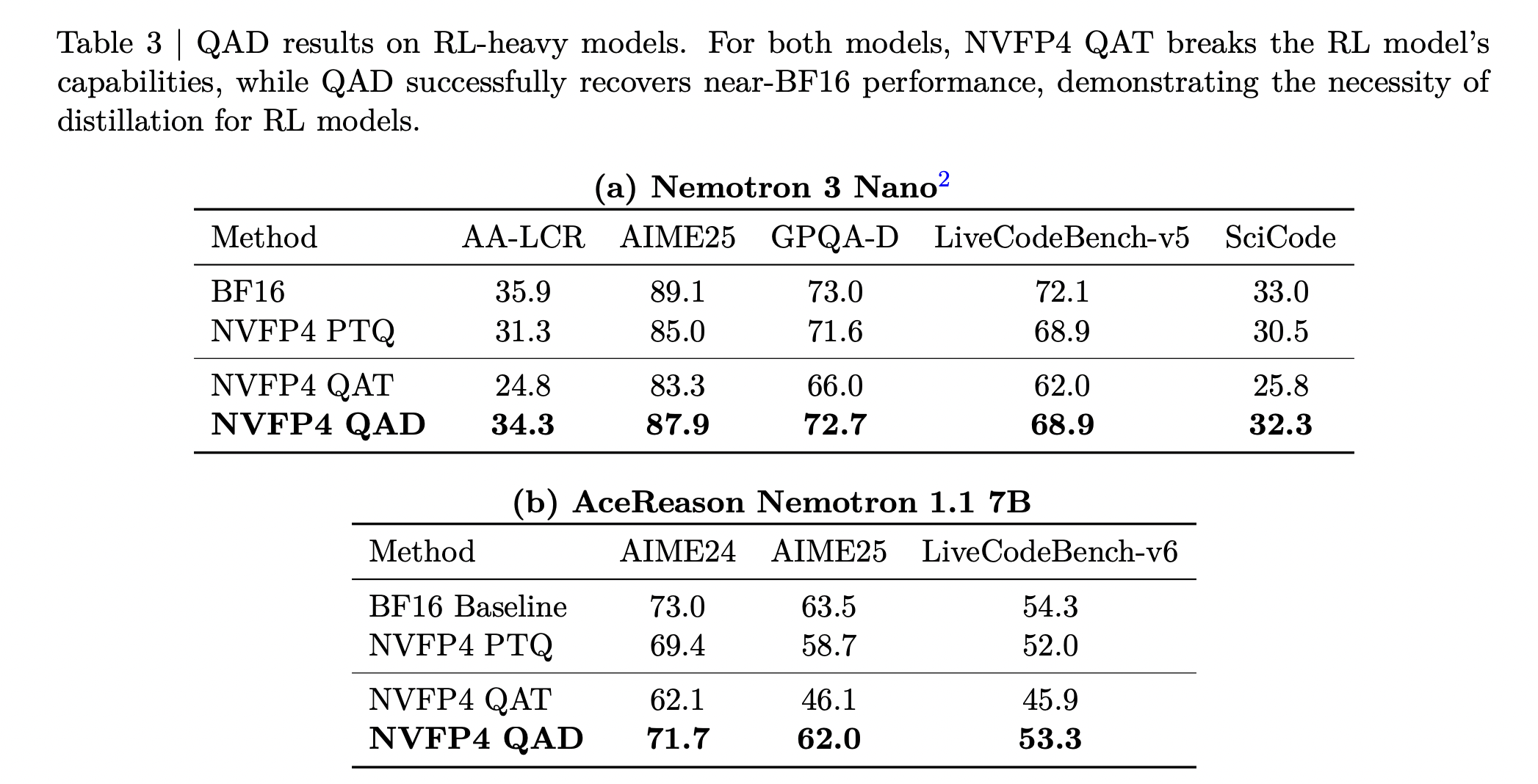 Nemotron-3-Nano-30B-A3B is one of the RL heavy models in the QAD research. The below Table shows accuracy on AA-LCR, AIME25, GPQA-D, LiveCodeBench-v5 and SciCode-TQ, NVFP4-QAT and NVFP4-QAD.