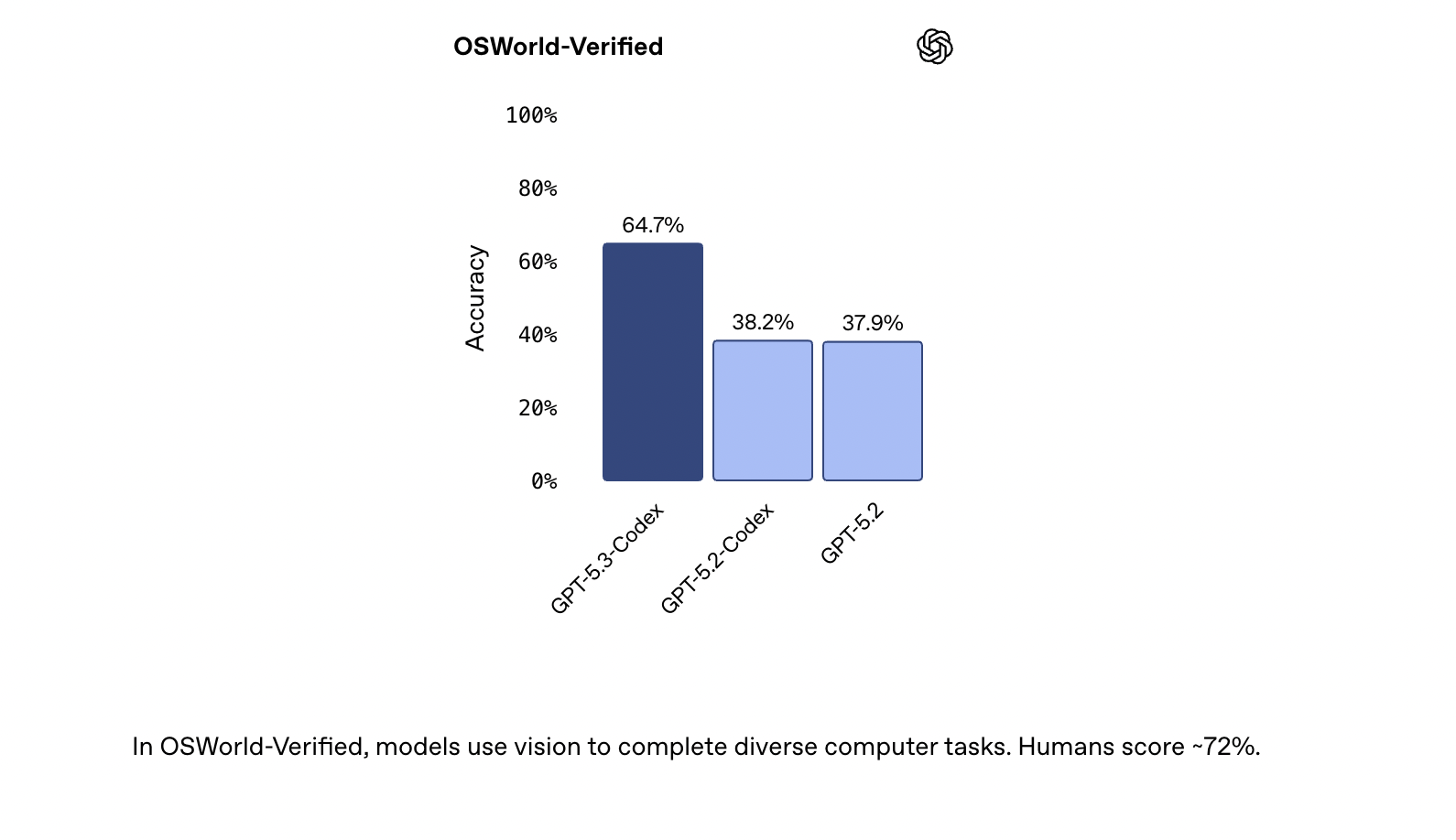 On OSWorld-Verified, an agentic computer-use benchmark where agents complete productivity tasks in a visual desktop environment, GPT-5.3-Codex reaches 64.7%. Humans score around 72% on this benchmark, which gives a rough human-level reference point.