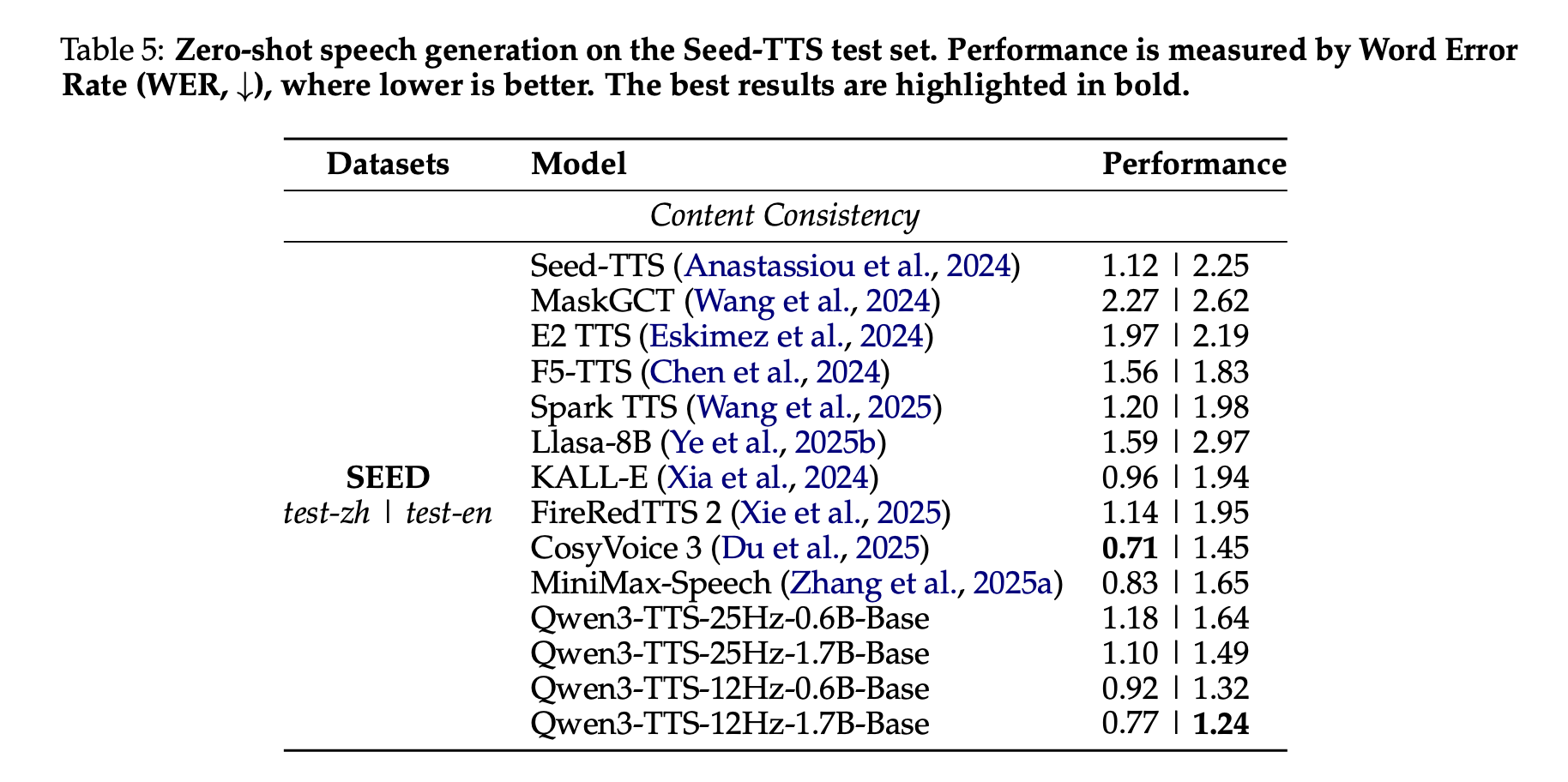 On the Seed-TTS test set, Qwen3-TTS is evaluated as a zero-shot voice cloning system. The Qwen3-TTS-12Hz-1.7B-Base model reaches a Word Error Rate of 0.77 on test-zh and 1.24 on test-en. The research team highlights the 1.24 WER on test-en as state of the art among the compared systems, while the Chinese WER is close to, but not lower than, the best CosyVoice 3 score.