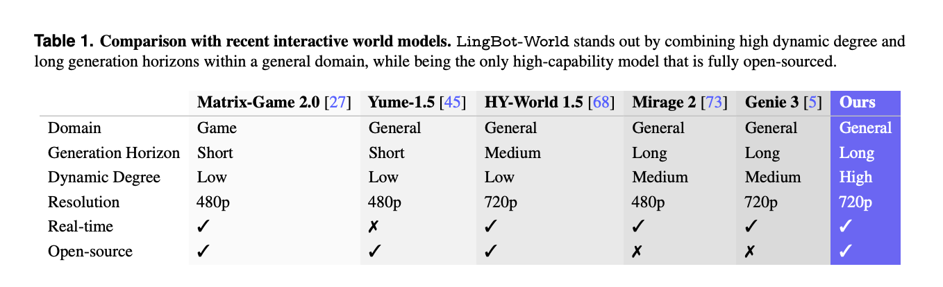 A separate comparison with other interactive systems such as Matrix-Game-2.0, Mirage-2 and Genie-3 highlights that LingBot-World is one of the few fully open sourced world models that combines general domain coverage, long generation horizon, high dynamic degree, 720p resolution and real time capabilities.