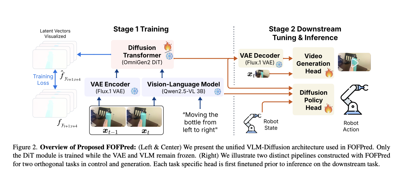 FOFPred uses a unified architecture that combines a frozen vision language model, a frozen VAE and a trainable diffusion transformer. The pipeline is: