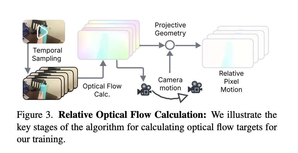 A critical contribution is the relative optical flow calculation used to build clean training targets from noisy egocentric videos. For each frame pair the method: