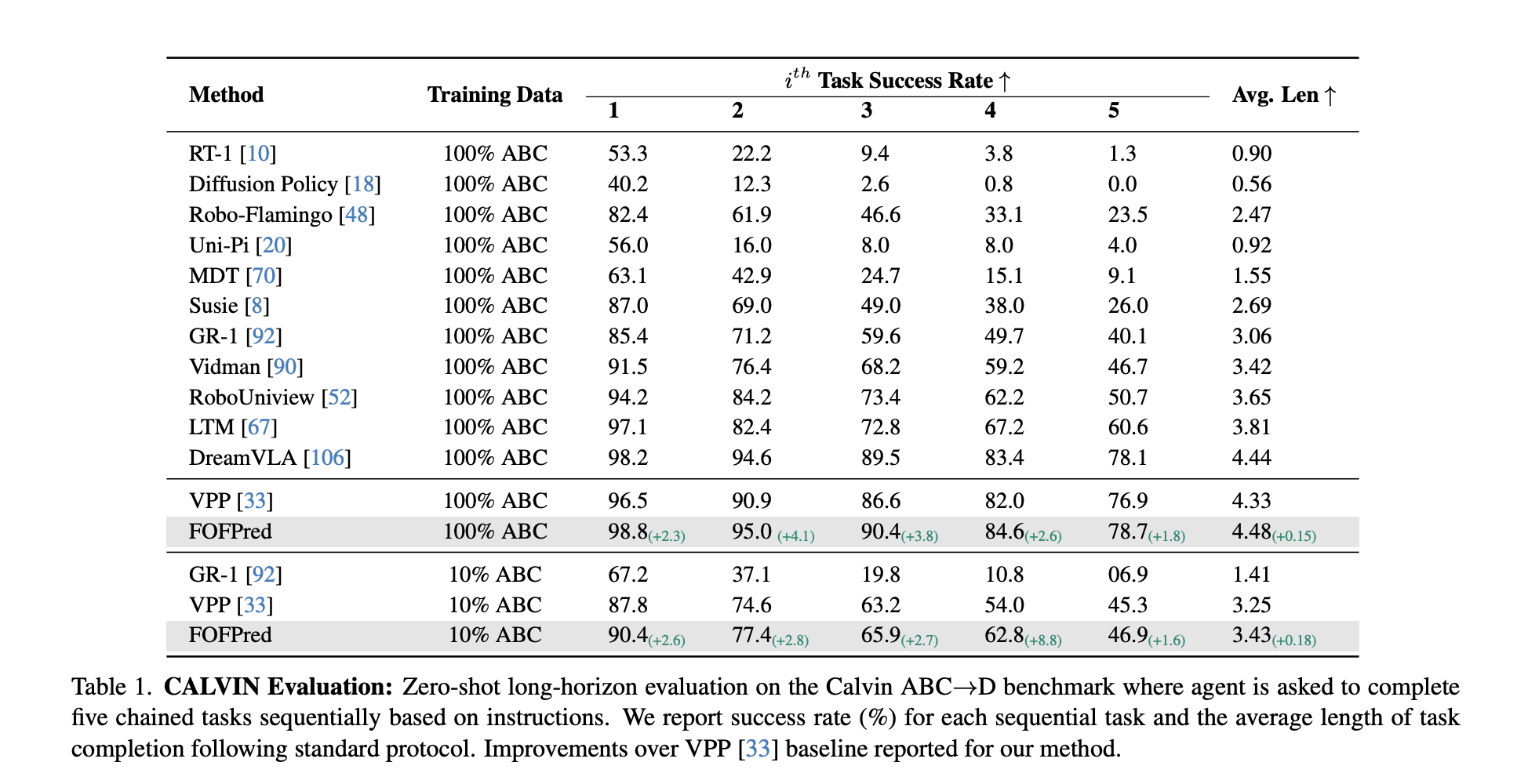 On the CALVIN ABCD benchmark, which evaluates long horizon zero shot chains of 5 language specified manipulation tasks, FOFPred reaches an average chain length of 4.48. VPP reaches 4.33 and DreamVLA reaches 4.44 under the same protocol. FOFPred also attains a Task 5 success rate of 78.7 percent, which is the best among reported methods. In a low data setting with 10 percent of CALVIN demonstrations, FOFPred still reaches 3.43 average length, higher than the 3.25 of VPP.