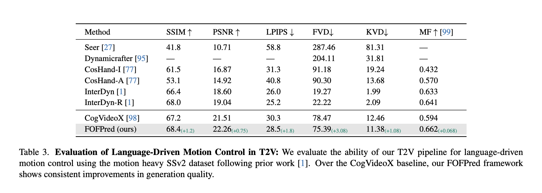 - For text to video generation, connecting FOFPred to Go with the Flow yields better SSv2 metrics than CogVideoX, with higher SSIM and PSNR, lower FVD and KVD, and improved motion fidelity, while requiring only language and a single frame at inference, making FOFPred a reusable motion controller for both robotics and video synthesis pipelines.