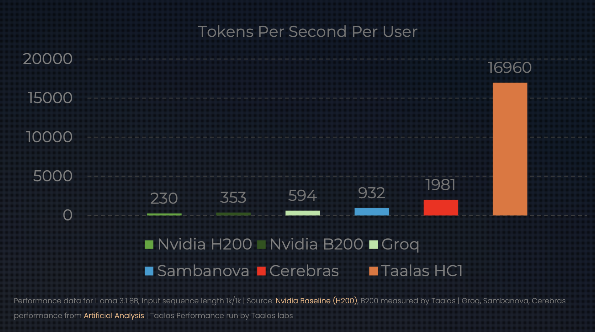 The results of this ‘direct-to-silicon’ approach redefine the performance ceiling for inference. At their latest unveiling, Taalas demonstrated the HC1 running a Llama 3.1 8B model. While a top-tier NVIDIA H100 might serve a single user at ~150 tokens per second, the HC1 serves a staggering 16,000 to 17,000 tokens per second.