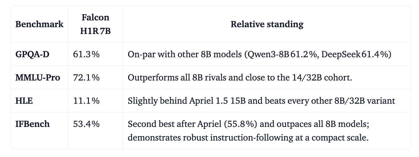 Technology Innovation Institute (TII), Abu Dhabi, has released Falcon-H1R-7B, a 7B parameter reasoning specialized model that matches or exceeds many 14B to 47B reasoning models in math, code and general benchmarks, while staying compact and efficient. It builds on Falcon H1 7B Base and is available on Hugging Face under the Falcon-H1R collection.