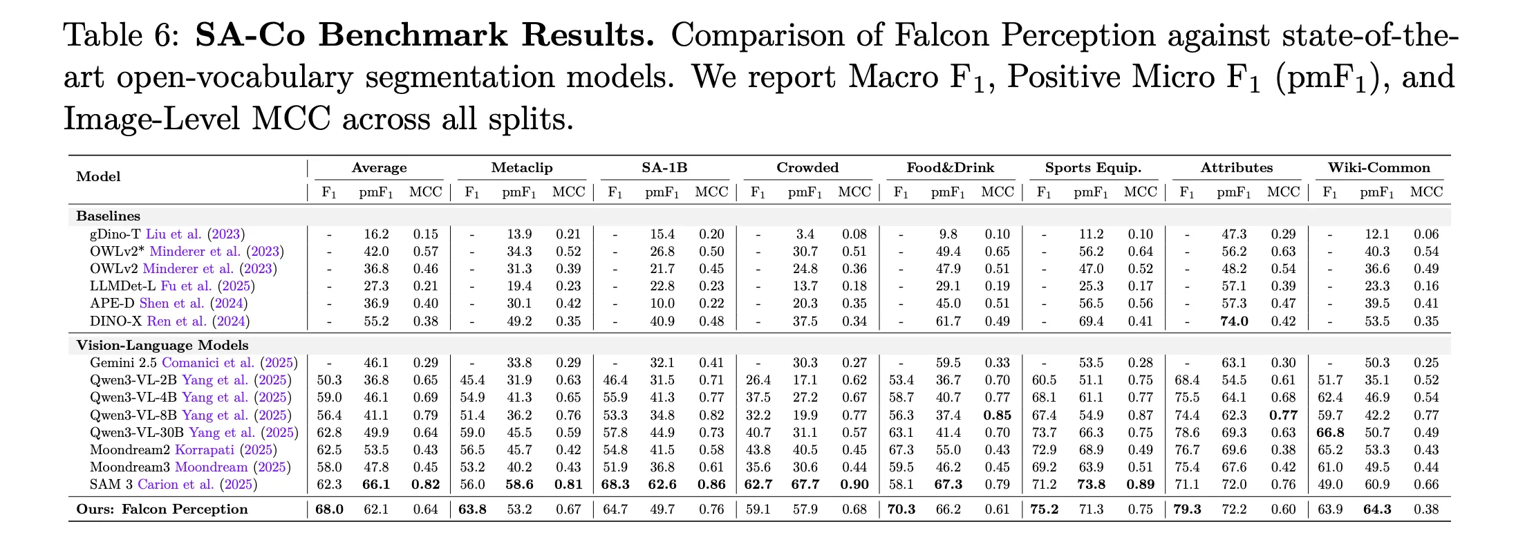 | Benchmark Split | SAM 3 | Falcon Perception (600M) |
