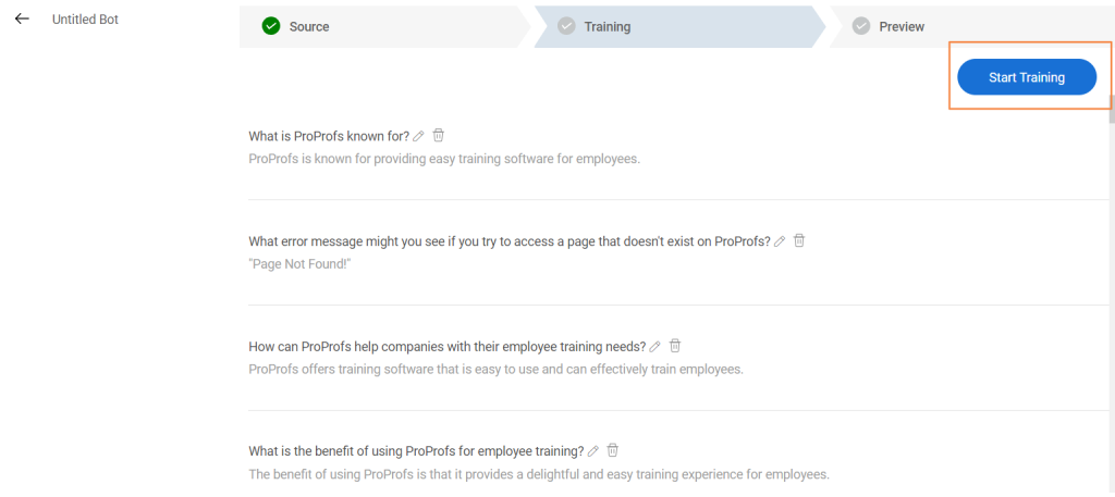 3. All the important information from your website is now organized and ready for your bot to use. ProProfs AI automatically converts your website data into helpful questions and answers, so your chatbot can easily handle customer queries.