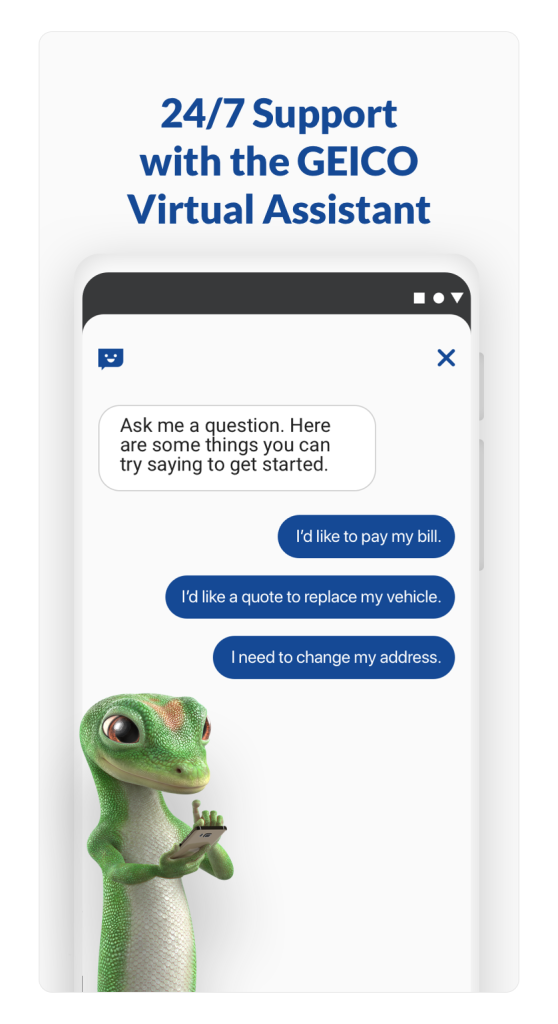 GEICO’s Virtual Assistant chatbot is designed to help policyholders manage their insurance needs quickly. Whether it’s updating a policy, answering billing inquiries, or filing a claim, the chatbot can assist customers around the clock.
